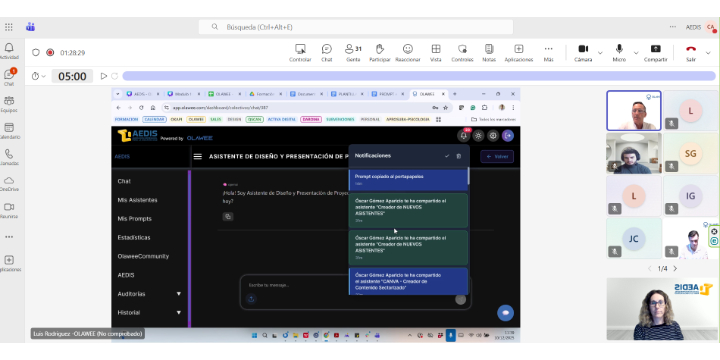 Durante la formación se ha presentado OLAWEE como una aplicación web que integra en un único entorno diferentes modelos de IA generativa como ChatGPT, Gemini, DeepSeek y Perplexity. La herramienta permite crear asistentes personalizados, diseñar prompts propios y compartirlos dentro de la organización o con la comunidad de AEDIS.