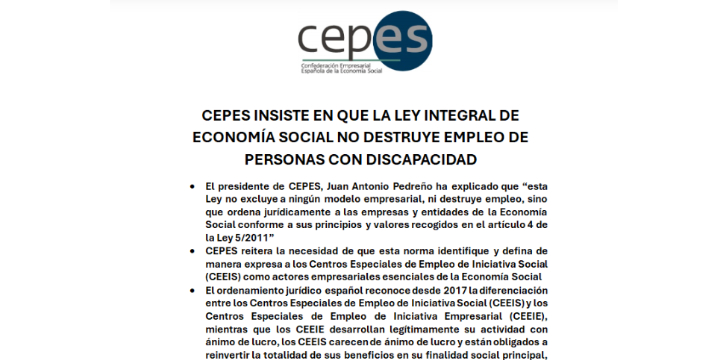 La Confederación Empresarial Española de la Economía Social (CEPES) ha insistido en que el Proyecto de Ley Integral de Economía Social no excluye a ningún modelo empresarial ni provoca pérdida de empleo. La organización ha explicado que la norma ordena jurídicamente a las entidades de la economía social conforme a sus principios y valores, con el objetivo de aportar seguridad jurídica y coherencia al sector.